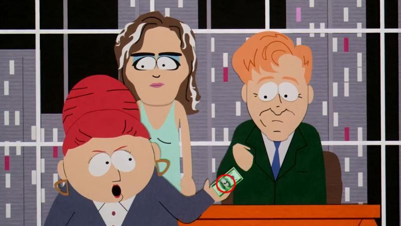 South Park Movie - Bigger, Longer, and Uncut at about 25:00 - Sheila hands Conan a dollar bill with an alien on it! |
