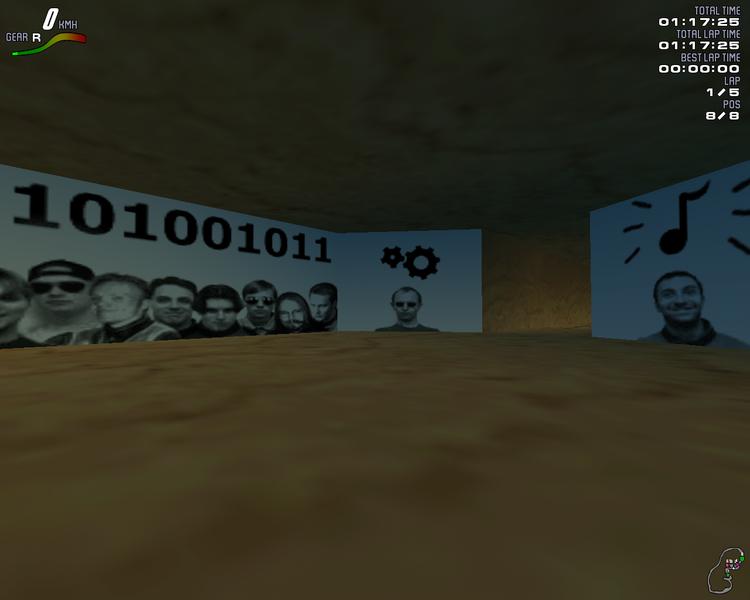 Drive round the first corner, and you should see a part of the road where there is a bridge or something above you (in the rocky area before the road spilts). Just past the 'bridge', drive into the rock face on the right. Its difficult to explain exactly where the 'hidden corridor' is, but keep trying, and eventually you will find yourself driving down a tunnel, and at the end is a square room with pictures on the wall of the Digital Illusions team!