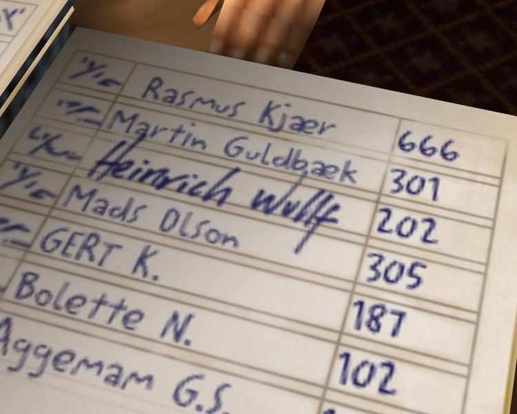 "Traditions of the Trade" mission - when Hitman is chatting up the receptionist, you can look in the guest book for Mr.Wuffs room. Also listed in the guest book are a number IO development team members. Martin Guldbaek and Rasmus Kjaer from the graphics and design team are listed, as is Mads Olson from the Q.A. department.