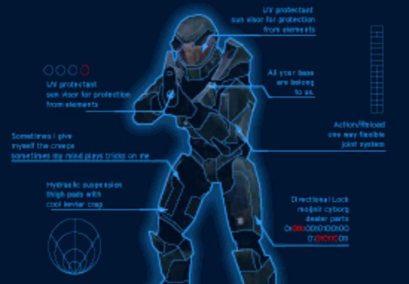 Check out the second text(from up) on the rigth side of Master Chief it sais: "All your base are belong to us"(this is from an old game called Zero Wing... wich was very badly translated(WHAT YOU SAY ;-)) And there are other funny phrases around Master Chief... you have to read them real close to the screen to see them :)