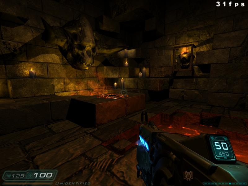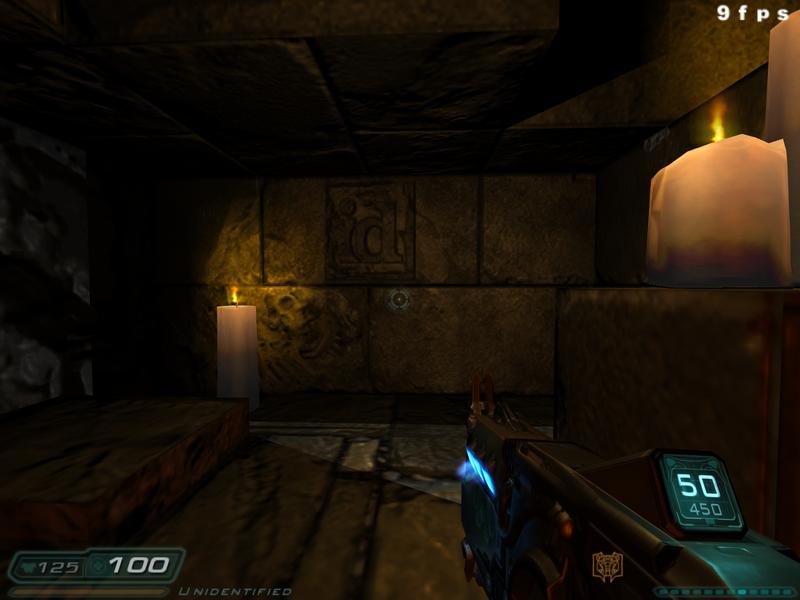 This will take you to a dead end but if you crouch and face the wall of the actual dead end, right above the floor under a few protruding bricks, you will find the id-logo etched in the stone wall. Place your cross-hair over it and it will give off the regular blip-sound you get when you use a computer. Now click the logo and it along with the brick it is etched on will sink into the wall with a scratching noise. Now a new path to your left will open, leading you into a chamber filled with an eerie red light and a huge horned skull on the wall in the back. Below the skull is a bloody pentagram with a PDA positioned in the middle. Download the data from the PDA into your own and see what you got. You will find data from the PDA of "iD-Software" and it is filled with e-mails from everyone involved in the Doom III-project thanking their loved ones, their fans and giving their general thoughts on the projects.
