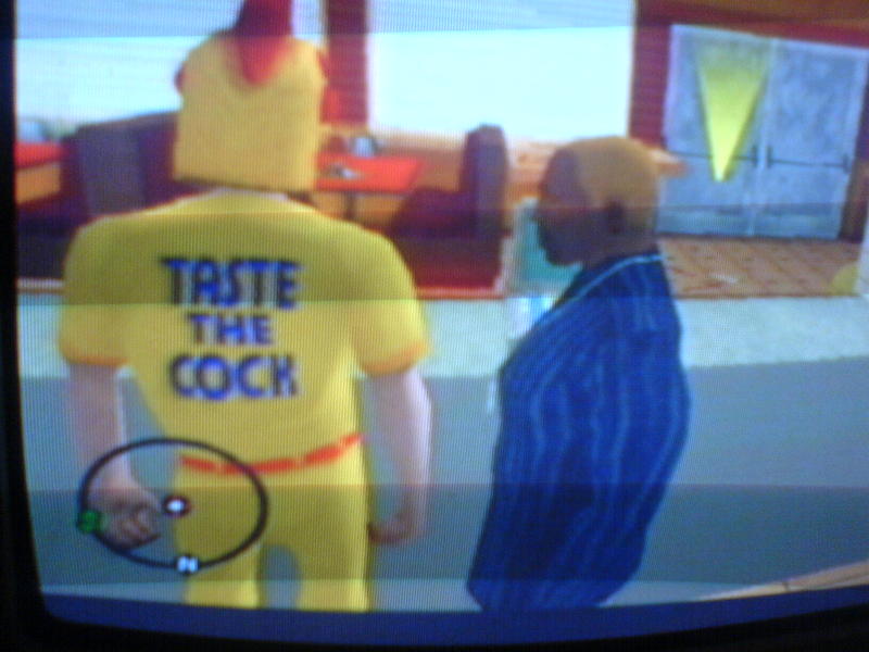 Go into any Cluckin' Bell restaurant. Jump over the counter and turn around. The back of the workers' shirts say "Taste The C*ck".