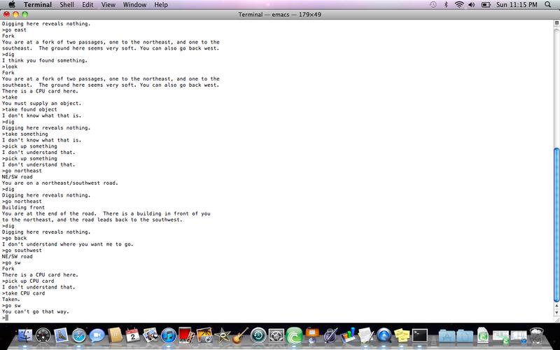 it was posted at Mac OS X hints a while ago. Just type "emacs -batch -l dunnet" (without quotes) into the terminal and it will bring up and old school text based game, kinda like a MUD, except you are the only one in it.