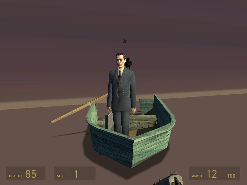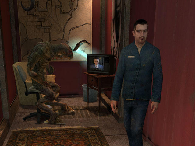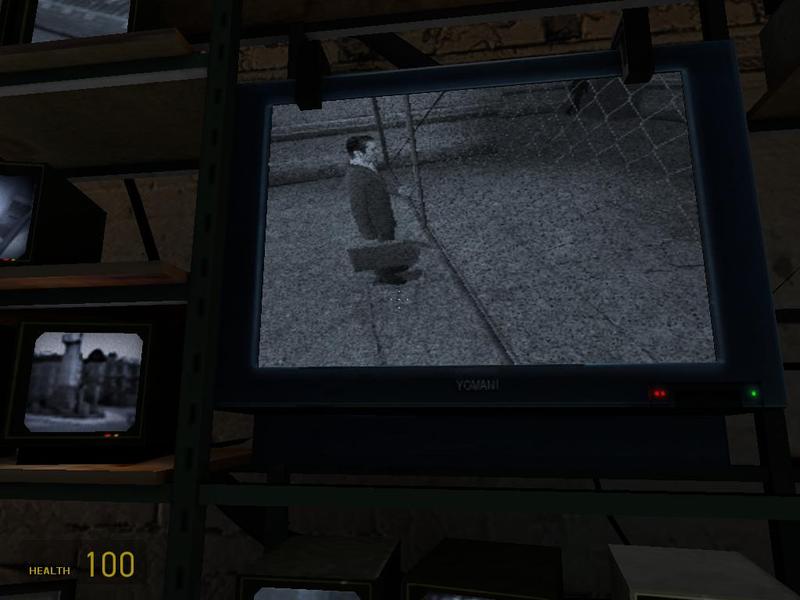 This "G Man" dude appears far more (at least that I've noticed) in HL2 than he did in the original one. I havent' seen him in person in HL2, but I recall from HL1 he always appeared in inaccessible locations and if you used NOCLIP to get to him and tried to shoot him, sparks flew off him like if you try to shoot at the wall. Also, it's MonitOr :)