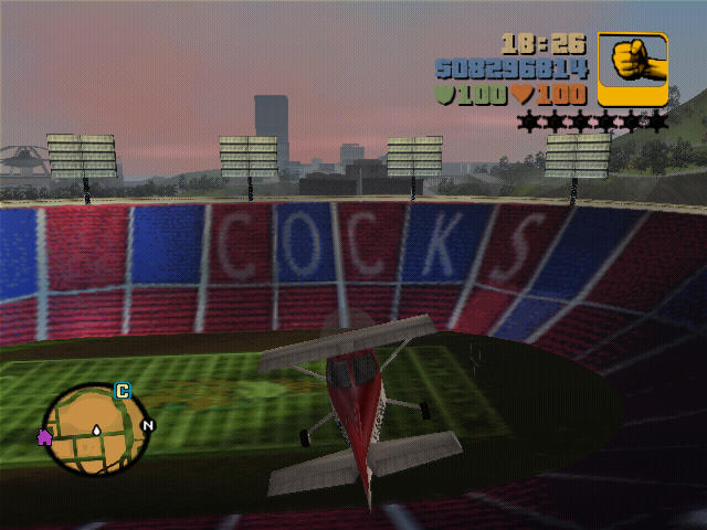 First off you need a 'flatbed', then go to the stadium on the second island and park the flatbed FRONT FIRST against the entrance. Then get a mule and park it BACK FIRST at the entrance next to the flatbed. This is the tricky part, jump onto the back of the flatbed, then jump onto the bit where you sit and drive and you will notice a small invisible hill, stand on the top of this hill and jump on the back of the mule. From here you can see in the stands the word 'COCKS' written in them. (ADMIN: Cocks being the name of Liberty City's football team)