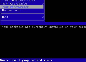 Also, if you run aptitude normally and look in the menu, there is an option to play Minesweeper. Tooltip: "Waste time trying to find hidden mines"