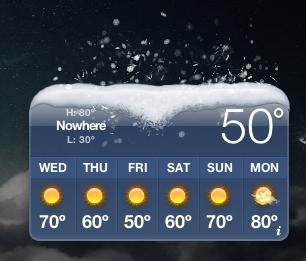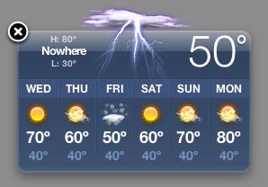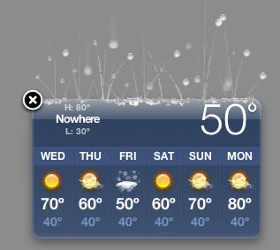 You proabably knew all that, but not hold down the command ('Apple') and option ('alt') buttons together whilst clicking on the weather symbol at the top of the widget itself and watch the current city's name change to 'Nowhere'. As you repeat this, you will see all of the different kinds of weather the widget is capable of depicting.