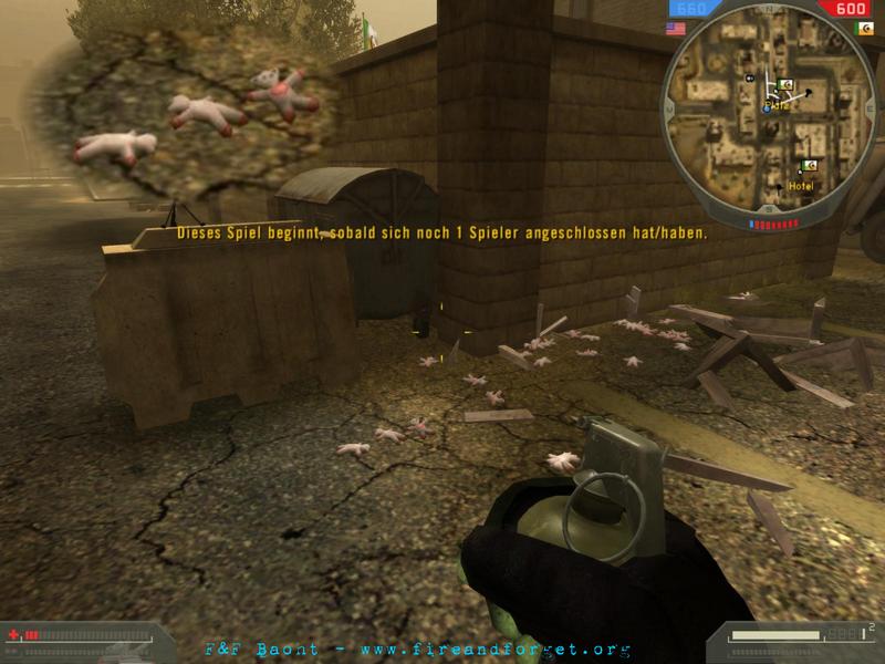 On the same map, (preferably on a local server, where there is no one around) Spawn as a US marine, and travel into the city. Don't take any turns, keep going straight until you come to a green building with an unmarked box by the entrance. It will be just south of the square outpost. Fire (or throw) any kind of explosive you have, except the mines. (hand grenades work best) Stand back, and blow the box open. Dozens of white teddy bears with pink hearts on their bellies will fly out, landing on the surrounding few meters.