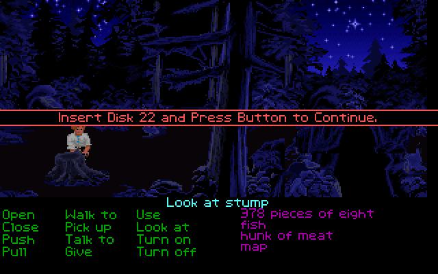 How about the stump in the forest....When examining the stump, Guybrush proclaims that a hole in it leads to a maze of caverns. If Guybrush tries to climb down into the stump, the game prompts the player to successively insert "disk #23," "disk #47" and "disk #98." (The game was actually distributed on 4 or 8 floppy disks.) The endgame credits also have an entry for "art and animation for disk #23."