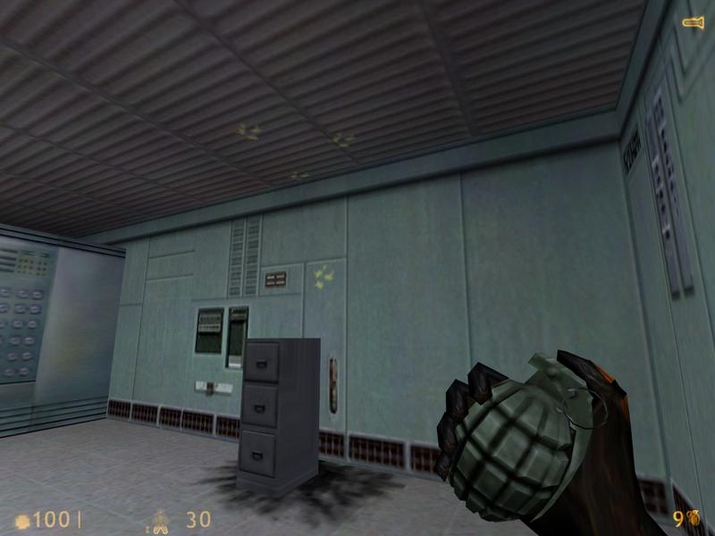At the very beginning of the game ,before the accident, after exiting the intro train, type "impulse 101" into the console to get all weapons. Then locate the room where G-man is talking to a scientist. Shoot the glass to get into the room. Go to the small filling cabinet against the wall. You will first observe that the cabinet looks strange when you look at it from different angles, then throw a grenade at the bottom of it and when it explodes alien blood comes out!