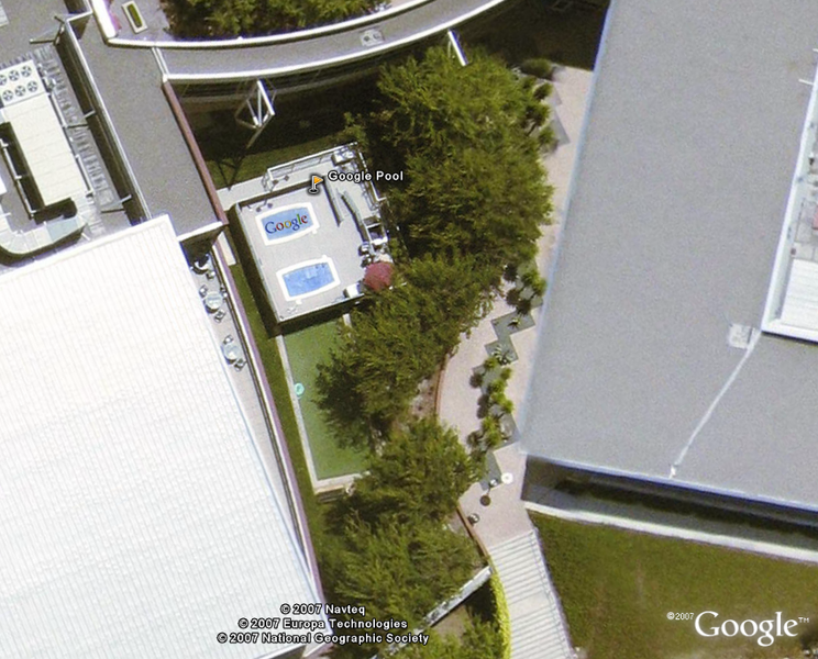 When I went to the Mountain View Google Headquarters, we walked by the pools. We were told they are lap pools. The man giving us the tour told us that the logo was edited into the satellite image later. I did not see a logo when I looked into the lap pool.