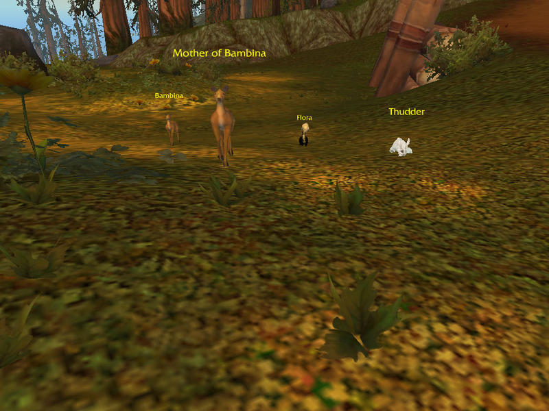 3. Bambina (Bambi), Mother of Bambina (Bambi's Unnamed Mother), Flora (Flower), and Thudder (Thumper) will all be walking in close proximity to the Westfall Brigade Encampment where the ground is yellow (You will know what I mean when you get there). Also, there is a mob named "Westfall Brigade Hunter" who will occasionally spawn and shoot Mother of Bambina and do a /cheer, causing Bambina to become enraged, get renamed to "Vengeful Bambina", and start attacking the Hunter.