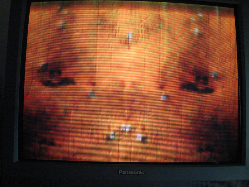 | on the outher side of the megg tribute there are two scorch marks that look a lot like a skull (the marks that are half way up the yellow block) |