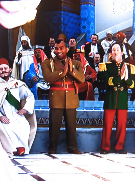 At the part when Lady Castofiore is entering the courtyard of the Sultan of Baghar, look at the audience. You only see him for a few views, so don't blink! In the crowd of important people there is Mr T! He has his trademark mohawk and is even in his generals uniform, medals and all! I don't know why he is in the movie, maybe someone could tell me any personal significance to both movies' creators?
